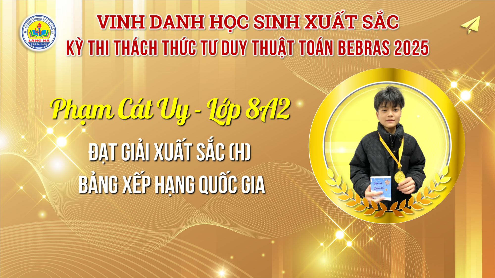 🏆✨ Xin chúc mừng em Phạm Cát Uy, học sinh lớp 8A2, trường THCS Láng Hạ, đã đạt giải Xuất sắc (H) - Bảng xếp hạng Quốc gia - Kỳ thi Thách thức tư duy thuật toán Bebras 2025! 💐