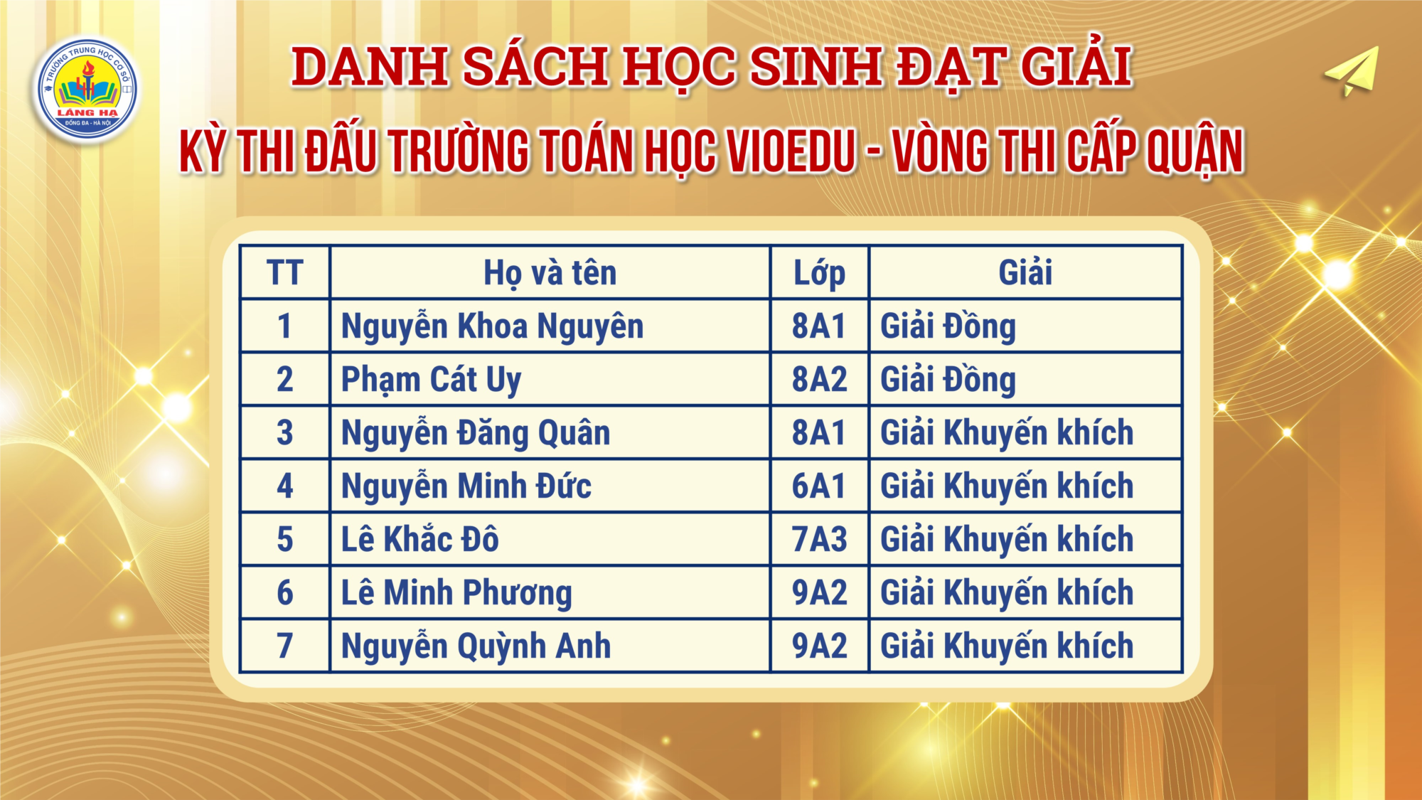 🏆 THCS LÁNG HẠ TỰ HÀO! các bạn học sinh của nhà trường đã tỏa sáng tại Kỳ thi Đấu trường Toán học Vioedu 2025 – Vòng thi cấp Quận, mang về những thành tích ấn tượng, thể hiện tinh thần học tập nghiêm túc, khả năng tư duy logic và niềm đam mê với môn Toán học! 🎉