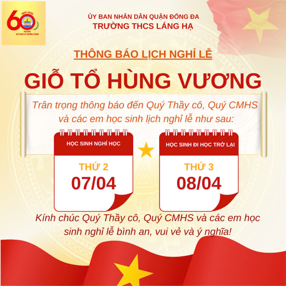 🏫 Trường THCS Láng Hạ trân trọng thông báo lịch nghỉ lễ Giỗ Tổ Hùng Vương như sau: