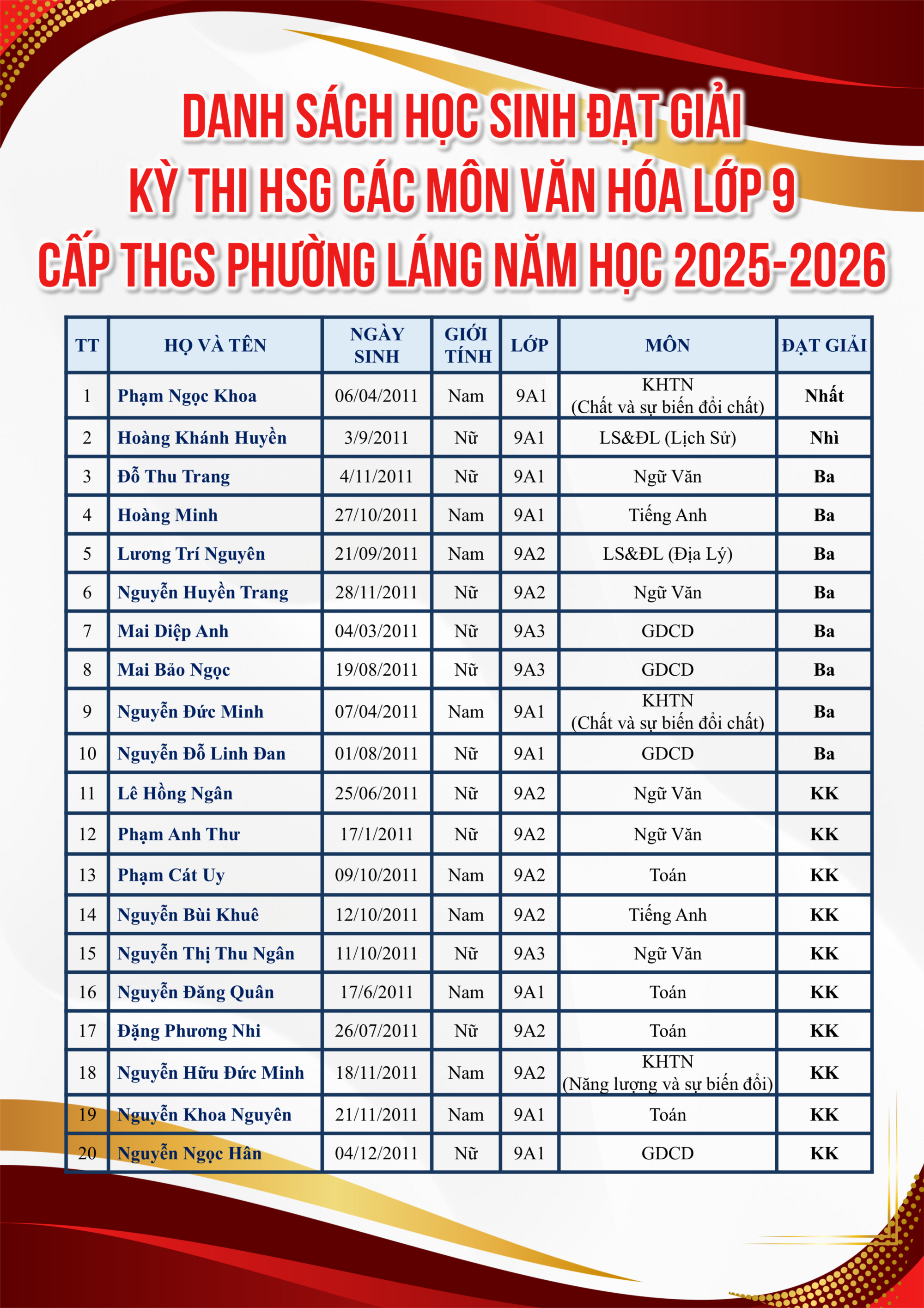 🎉 Nhà trường chúc mừng các em học sinh đã xuất sắc đạt giải trong Kỳ thi chọn Học sinh giỏi các môn văn hóa lớp 9 cấp THCS phường Láng, năm học 2025–2026 với kết quả: